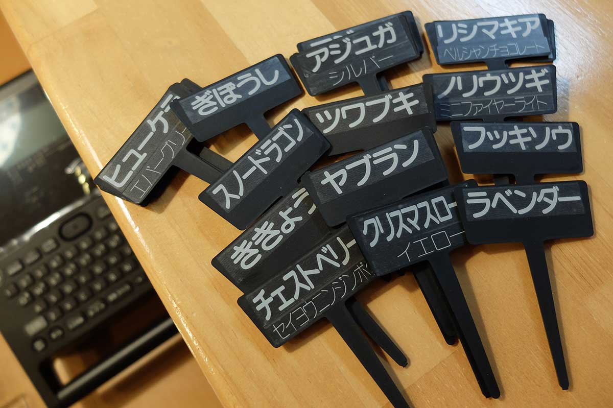 テプラ「SR-R980」を使って白文字ラベルを作成し、黒い園芸用挿しラベル(株式会社コンヨ「Family Tree T型ラベル」)に貼り付ける。書体はモリサワフォントの「ナールE」と「ナールEL」。植物園の説明看板をそのままミニチュアにしたようなものが出来上がった。ナールは完成度が高くバランスが良いからかきつい詰めや変形によく耐え、とても収まりが良いものが作れる。画面上で印字結果を追い込むのは手動写植機「PAVO-KY」を操作しているようで、 脳内に快感が行き渡る。こんな変態は世界中探しても私しか居ないだろう。