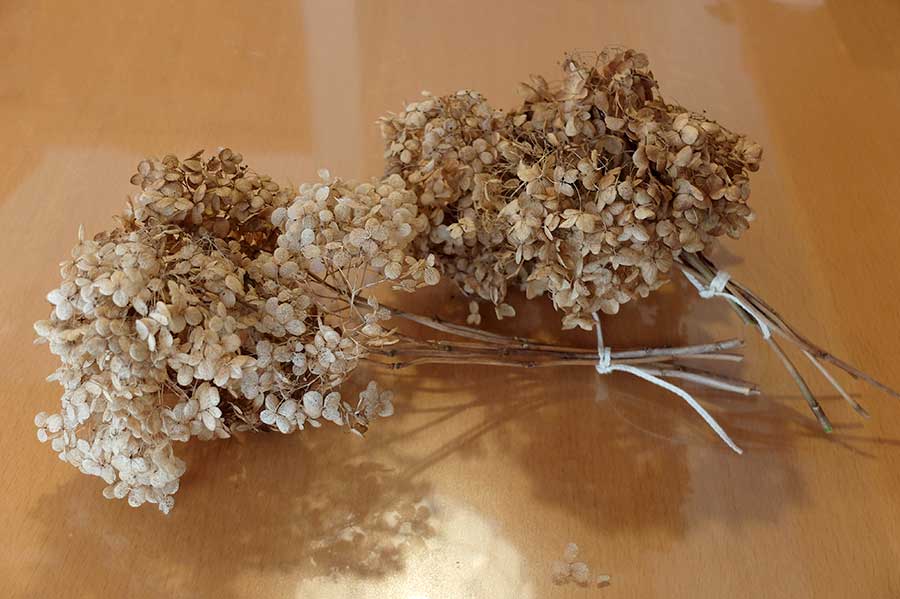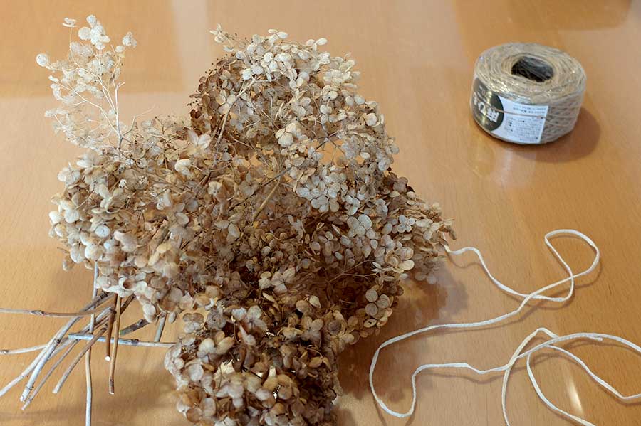 庭で採取したアナベルの枯れた花。これを紐で括って……