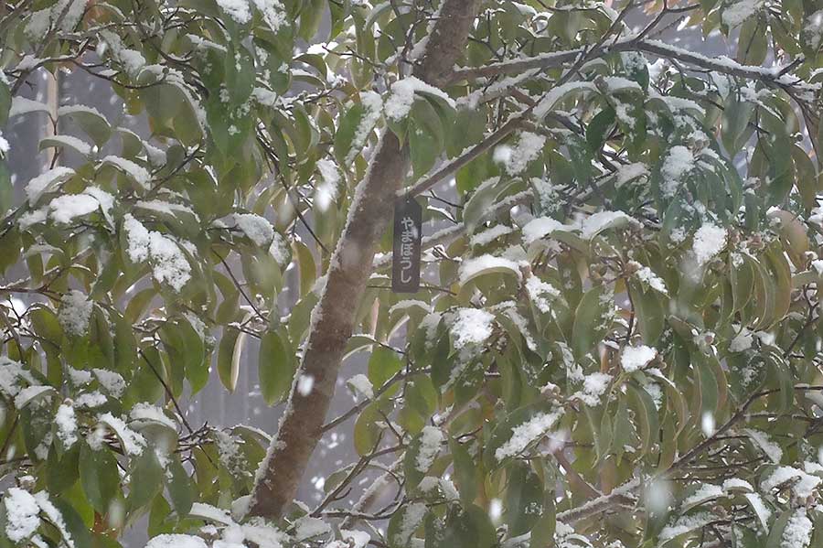 同じ日とは思えない程の大雪だ。常緑ヤマボウシ(ホンコンエンシス)にひっそり揺れる黒ラベル。