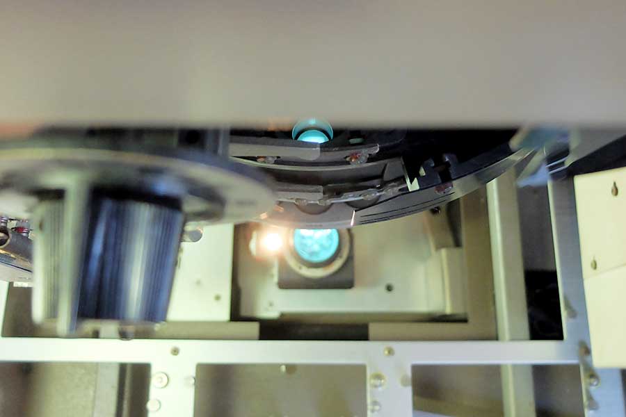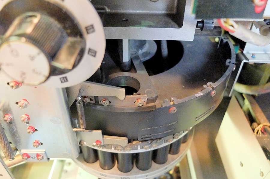 まずは主レンズターレットの上にあるJQレンズを表裏とも磨く。横から伸びている爪を手で外してターレットを回し、全てのJQレンズを磨いた。