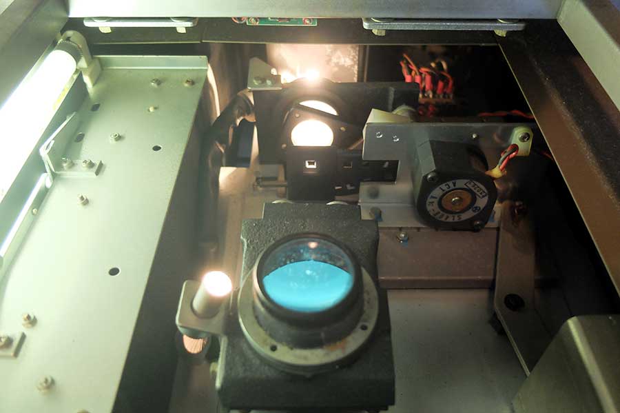 続いて変形レンズを裏から見たところ。本来透明な筈のレンズ面が白っぽくなっており、埃が溜まっているのが分かる。これも全て拭いた。左下の傘歯車は変形レンズダイヤルに動力伝達していて、キーボードで変形レンズを選択すると「ニ゛ンニヾヾヾ……」と噛み合うような音を出しながらダイヤルが回る。