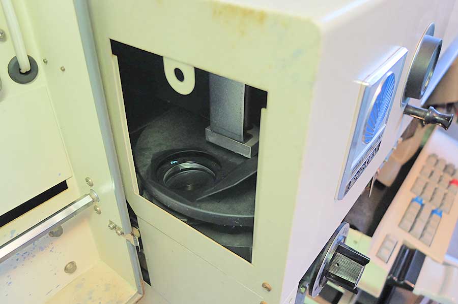主レンズを100Qにしてファインダーに投影したところ、文字が鮮明に結像せず曇ったようになっていた。埃が溜まってしまったようだ。2011年にこの写植機を譲り受けた時も初めて現像したところ濃度が出ず、レンズの埃が原因だった。