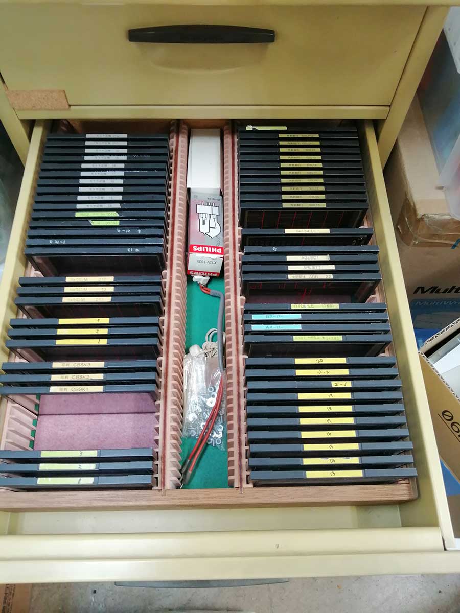 「弊社で昔使用していた写植機が5台現存していることに気がつきました。埋もれている荷物をどかして見たところ、外見だけの様子は保存状態も良く、メインプレートやサブプレートなども相当な量が残っていました。
