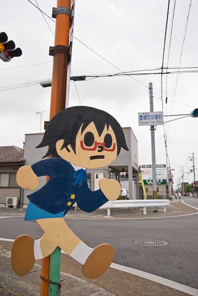 旧中山道と交わる豊郷町役場前交差点には飛び出し和ちゃん。真面目な彼女だけに、役場の前に相応しい人選です。