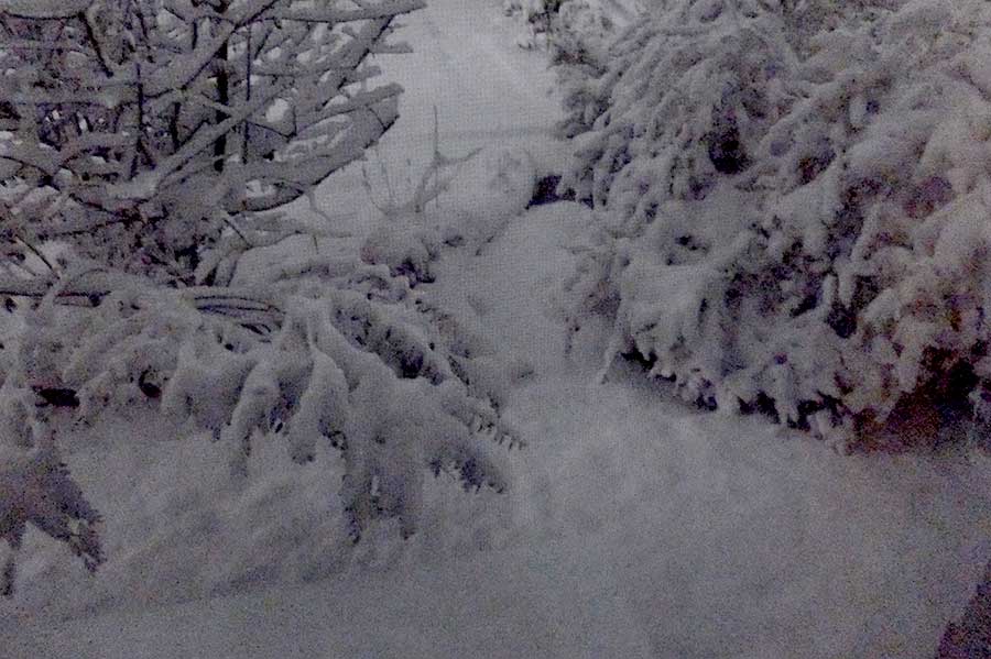 夜になると一面綿帽子の世界。空は明るく視界が利く。不思議なメルヘンの世界になった。 |