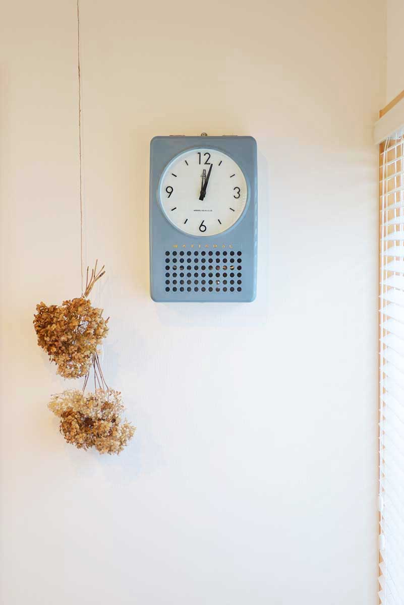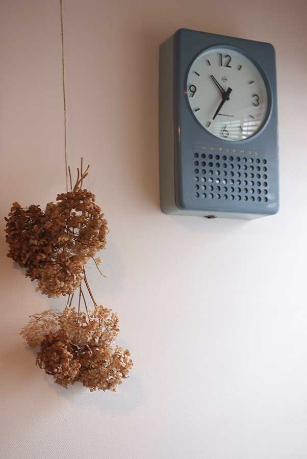 ナショナルの電磁式振り子時計「NBC-101」とアナベルの自家製ドライフラワー(再掲)。65年も前の時計なのに、現代の住まいの価値観に無理なく溶け込む普遍性。新しい古いなんて陳腐な物差しは捨てて、何があったらいいか、何をしたらいいかだけを考えていこう。そんな思いを密かにこの場所へ込めた。