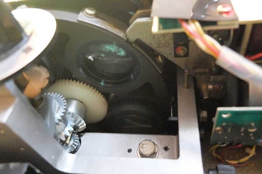 続いて変形レンズを裏から見たところ。本来透明な筈のレンズ面が白っぽくなっており、埃が溜まっているのが分かる。これも全て拭いた。左下の傘歯車は変形レンズダイヤルに動力伝達していて、キーボードで変形レンズを選択すると「ニ゛ンニヾヾヾ……」と噛み合うような音を出しながらダイヤルが回る。