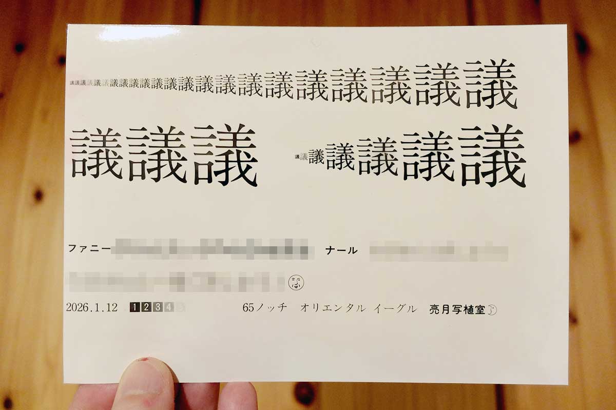 印画紙は黒白写真用の「イーグル」(オリエンタル写真工業株式会社製)の大カビネ判(2L判)。寒かったからか、現像液に入れて数分待ってからやっと黒い文字が浮かび上がってきてほっとした。写植機は無事のようだ。レンズは10Qと12Qがまだ曇っているようで極端に細く印字された。65ノッチではやや薄く、75ノッチでは露出オーバーだったので70ノッチ辺りが適正露出だろう。