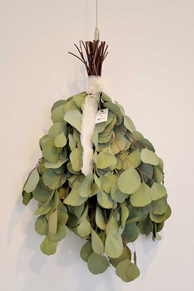 写植機の裏側の壁にはCreemaで調達したユーカリのスワッグをあしらった。