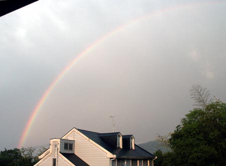 仕事から帰るとき、ふと東の空を見上げると大きな虹がありました。地平線から地平線まで、綺麗な半円を描いていたのです。 「虹が消える前に、家に帰らなきゃ……!」 家に着くなり思わず家族を玄関先に呼び、しばらく虹を見入っていました。よく見ると虹の外側に「副虹」*が見え、「こんな綺麗な虹はしばらく見たことがない!」と一同感激。そしてカメラのシャッターを押していたのでした。 *副虹 虹の外側に見えるうっすらとした虹で、二次虹[にじにじ]ともいう(ホントです)。 ![]() ![]() ![]() 玄関先で見えた虹の連続写真。実際にはもっと鮮やかでした 写真のとおり、副虹は写っていませんでした…… 地面から地面へ。まさに“虹の橋”でした。 「虹の端っこはどうなっているんだろう?」と気になるのが人情です。家から少し歩いて、山の下の街が見える所まで行ってみました。すると…… ![]() 虹の降りるところ 虹は山の向こうへ消えているのではなく、山のこちら側、つまり街に根を下ろしていました。虹は山で遮られるものだと思い込んでいたのでとても驚きました。写真では見えませんが、山の緑が虹に透けて見えていたのです。 「虹の降りたところには幸せが訪れる」といいます。きっといいことがあるでしょう。 ……振り返って西の空を見ると、すっかり晴れていました。明日はいい天気だ、と。 ![]() 虹が見えたときの西の空 少し経ってもう一度東に振り返ると、虹は殆ど見えなくなっていました。 もう少し見ていたかったけど、そう思うからこそ虹は美しいのだと思います。 虹を見つけると、どうしてあんなに嬉しくなってしまうのでしょうね。 2005.5.12 |