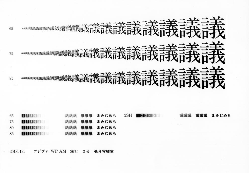 (※2014.2.6追記)他の写植機ユーザー様からは、写真用印画紙について、「SPICAでは濃度が上がらない」「当方の現像環境(自動現像機をご使用)では鮮明に出ない」といった報告も寄せられています。亮月写植室には自動現像機がないため皿現像で仕上げています。本稿はすべての写植機や現像の環境に当てはまるものではなく、普遍的な実験結果ではないことをお知らせしておかなければなりません。 |
