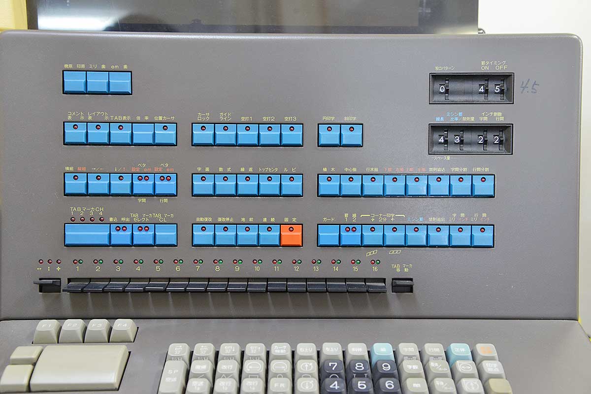 操作パネルとキーボード。平面的な盤面に各種ボタンが所狭しと配置され、高性能機であることがよく分かります。