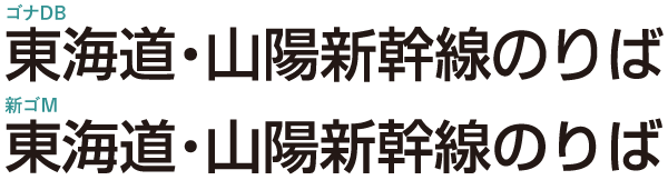 ゴナは漢字も仮名も仮想ボディいっぱいにデザインされていますが、新ゴは仮名がやや小さくて骨格のバランスが悪く、懐の広さがあまり活かされていません。文字を確実に読ませる必要があるサインシステムに使うにはやや苦しい感があります。