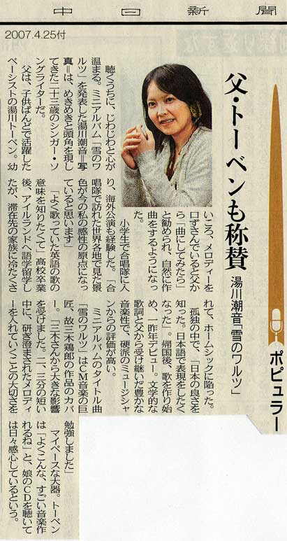 湯川潮音嬢は結構名古屋近辺を大事にしてくれてるようで嬉しいです。3月の三本の木ツアー、先々週のRORと。ラジオ出演も多かったし、インタヴューが4月25日付の中日新聞に載ってた。