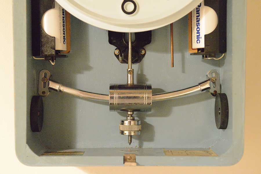 この掛け時計はムーブメントは機械式でありながら、振り子を動かし続ける動力としてぜんまいの代わりに電磁石を使用している。そのため本体の両側には単一乾電池を装塡するようになっている。右側が電磁石用、左側が時報用(正時に時刻の回数鐘を打つ)だ。本当は電気的な接点がなく寿命が長いトランジスタ式の振り子時計が良かったが、その前段階の技術である電磁式でも動作原理の面白味は変わらない。