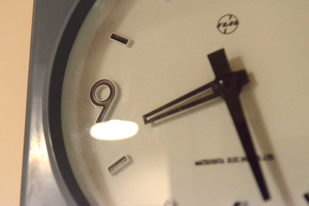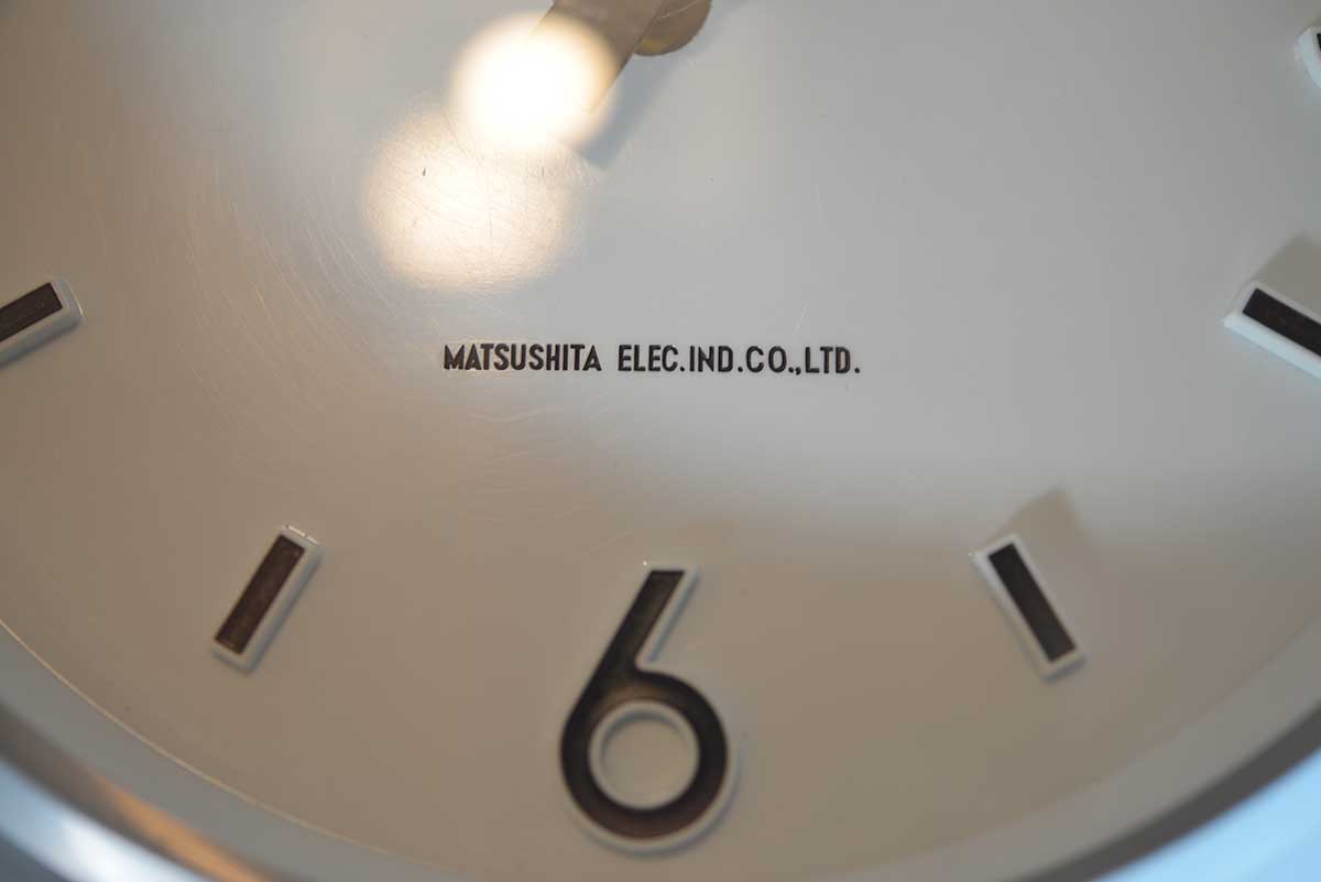 松下電器産業製であることもごく控えめに英語表記で記されている。ナショナルロゴといい、この時計の美しさを壊さないようにというデザイナーの良心と信念を感じる。
