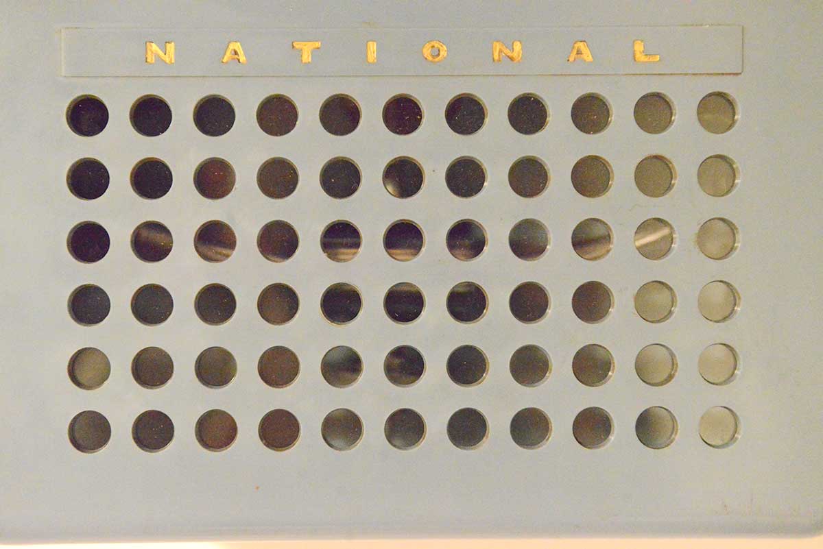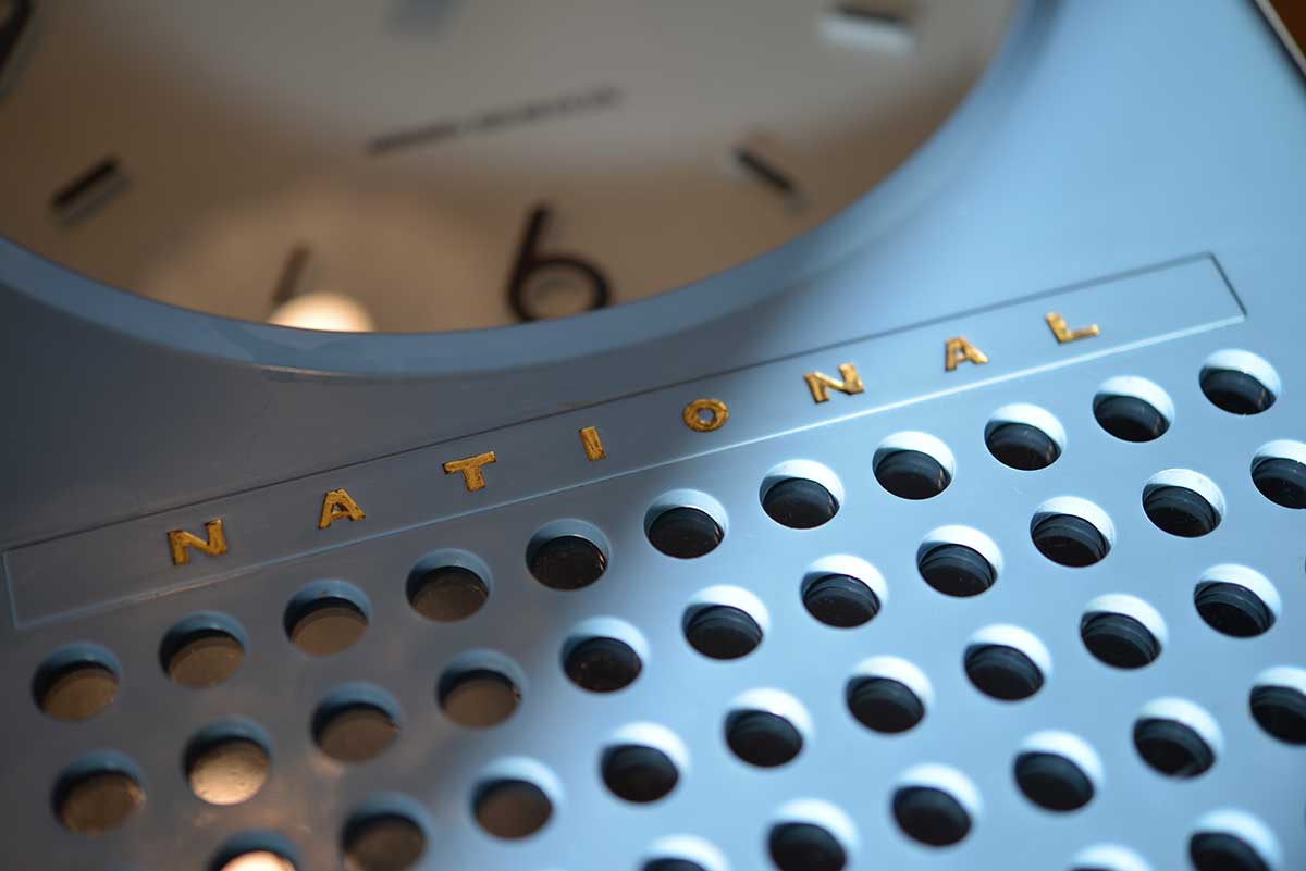 振り子の部分を覆うカバーは円い穴が6×11個空いていて、チラチラと振り子の動きが見える。そしてその上には金色に塗られた「NATIONAL」の文字。この機能美と造形美が素晴らしい。