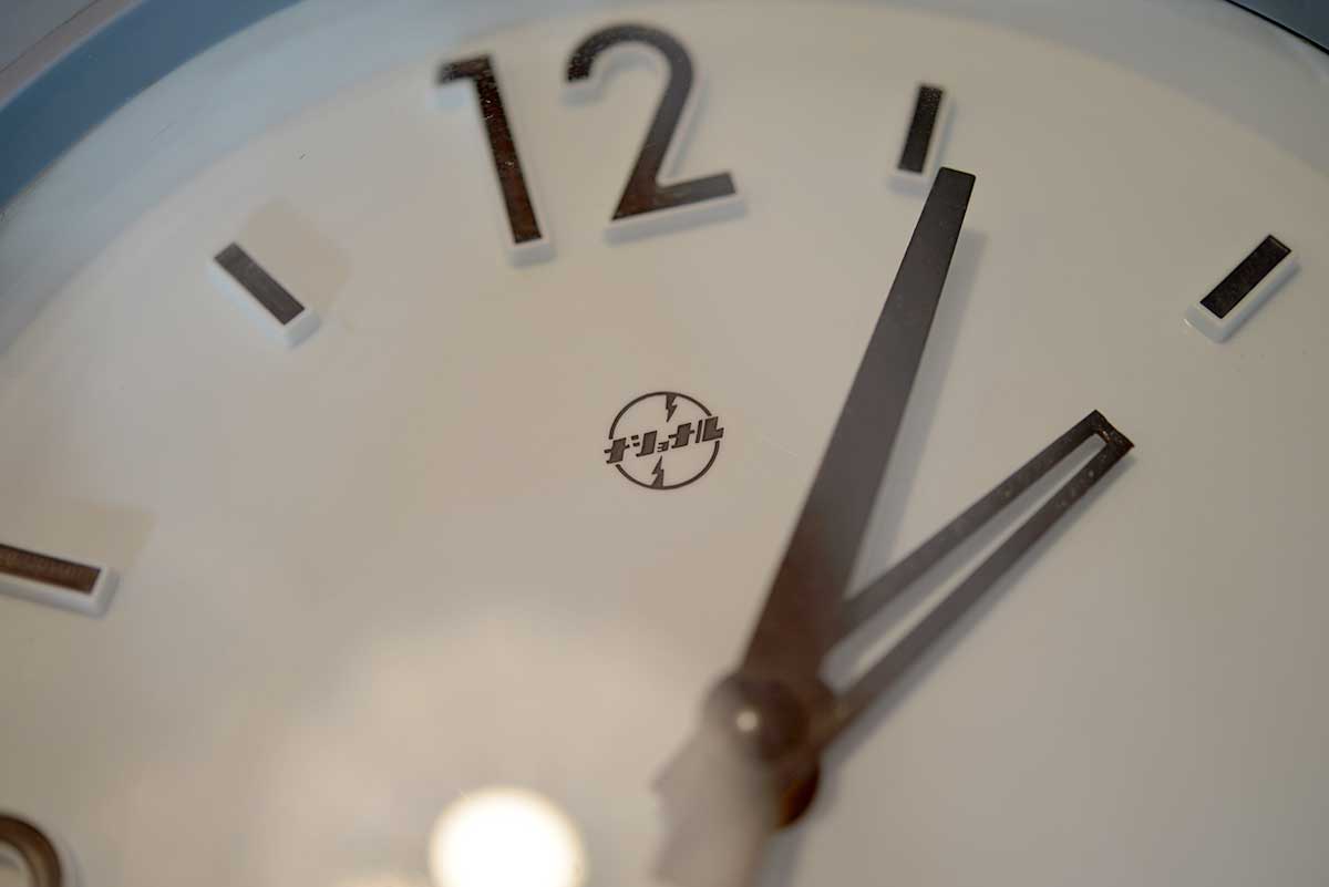 世の中で使われているのを見た時主張が強い(子供の頃はちょっと怖かった)と思っていた「ナショナル」のロゴは、ごく控えめに配置されている。分針は黒、時針は白抜きと明確に区別され、時刻がとても読み易い。