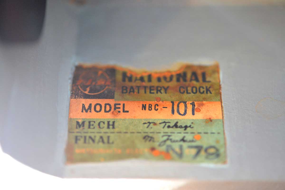 ナショナルのロゴは1937年に制定された旧ナショナルマークで、四角っぽく見える「Nマーク」が採用されたのは1959年(→パナソニックグループ公式サイト ブランドの歴史)。但し1959年以降もNマークに変えないで引き続き製造された製品もあるようだ。よってこの時計は1959年以前に設計され、その頃製造されたと思われるので、およそ65年前の製品ということになる。保存状態も意匠も、とてもそんな長い年月を経たものには見えない。
