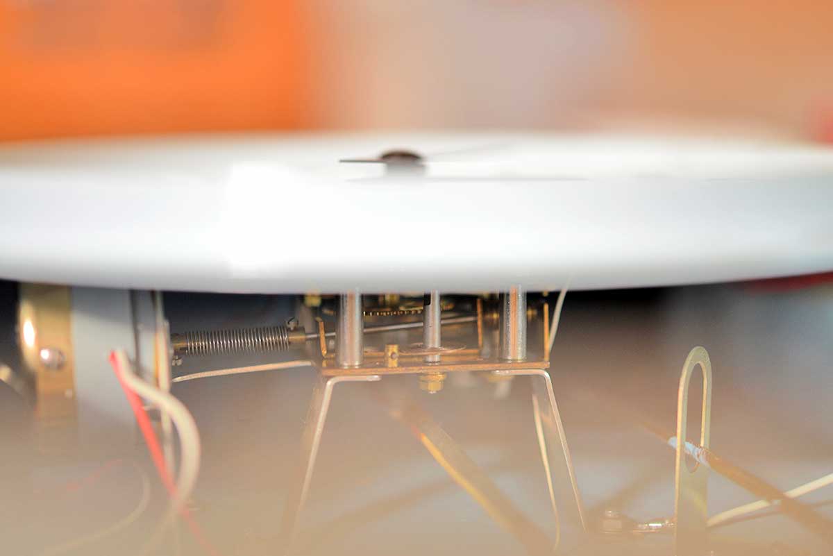 文字盤を下から覗くと、機械式ならではのムーブメント(中央の歯車周辺)と、その左側に大きなモーターが見えた。モーターは時打ち用の動力だ。これがばねと金属製の軸でハンマーに繋がっており、右下に見える棒鈴を叩いて音を鳴らすようになっている。