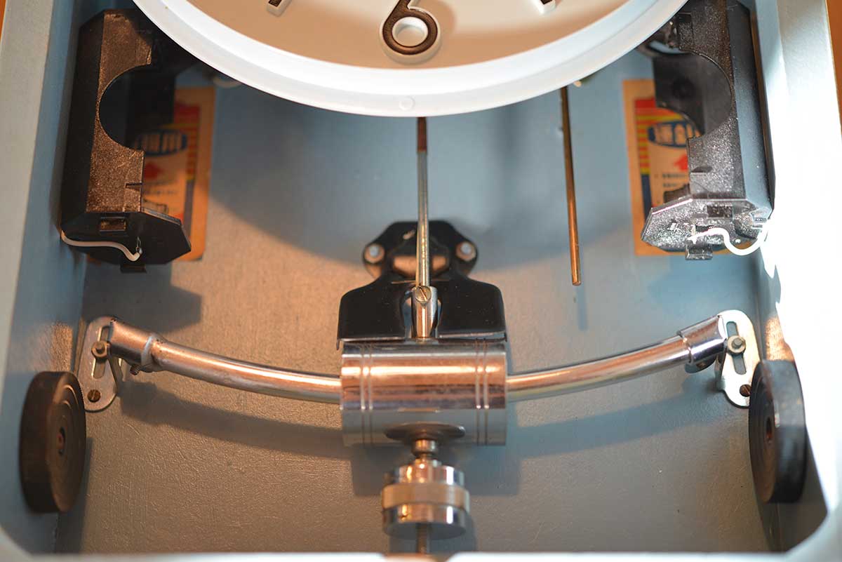 時打ち用の乾電池が液漏れしつつも、棒鈴などの鉄の部品やシールが綺麗に残るような安定した環境に置かれ、傷が付くこともなく大切に使われてきたか、放置されていたのだろう。パネルの円が沢山並んだ部分が茶色っぽく汚れていたので、喫煙者が居たのだろうか。お店? 誰かの家? 事務所? 想像が膨らんだが、新品のように修復されたこの時計が語ることはなかった。