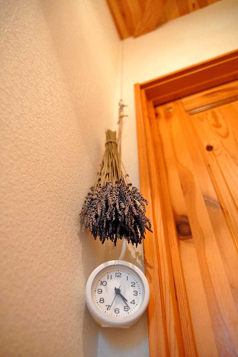 本来浴室のドアノブなどに掛ける為の時計だが、窓を開けることが多く寒さや湿気が入ってくる場所なので、耐久性の高いこの時計を選んだ。本体にフックが付いているので、天井に洋燈吊を捻じ込み、ワイヤーで吊った。それだけでは味気ないので、別途ラベンダーのドライフラワーを取り寄せて吊り下げてみた。