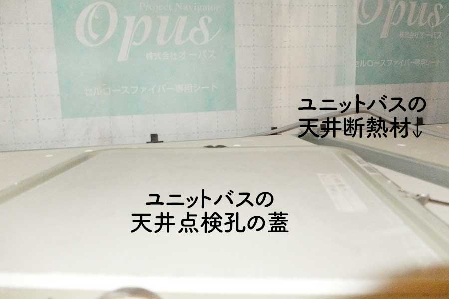 天井点検孔を開けたところ。写真では見にくいが、ユニットバスの天井断熱材は厚さ1cm程度の発泡スチロールが貼られたものだった。こんなに薄くて効果あるの? そしてオプションで35000円加算されている。発泡スチロールの原価から考えれば余りにも高すぎる(ぼっ×くり)!
