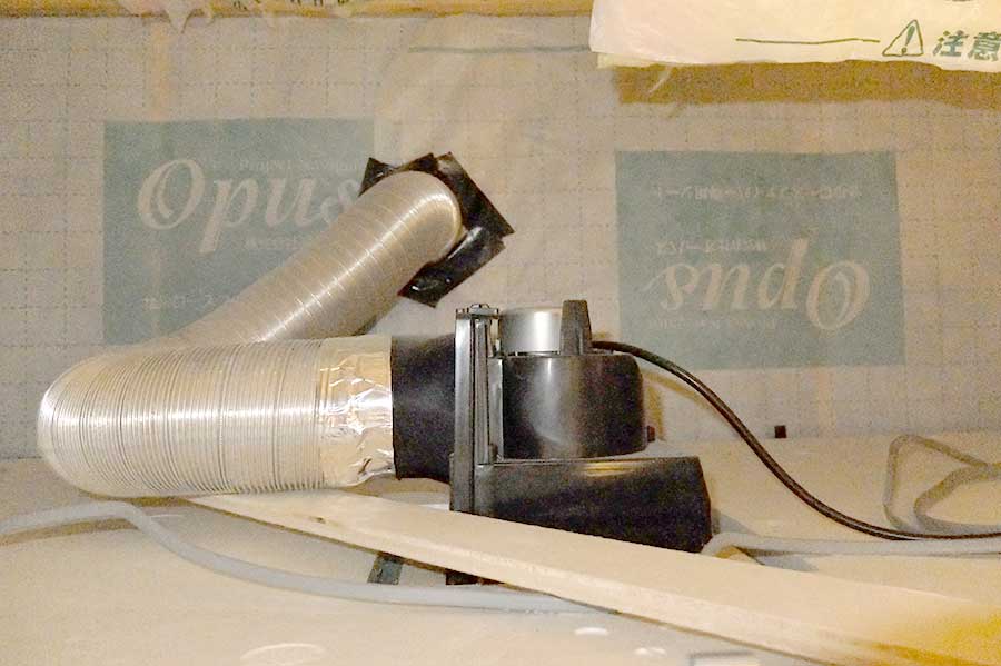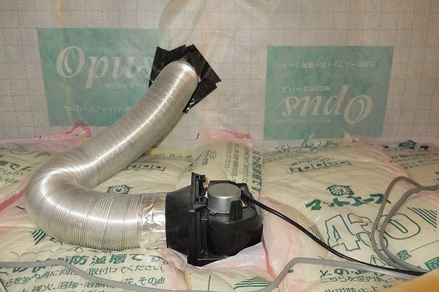 換気扇の設置状況。排気ダクトの方が本体よりも高く、それを補うかのように長い板がダクトの下に入れられて支えになっている。排気ダクトは外壁側に向かって勾配を取らなければならない(外壁側の方が低い)のに、逆勾配になっている。