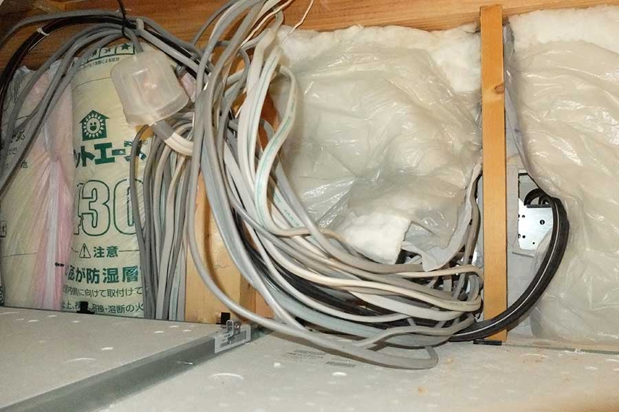 脱衣室のブレーカーに面した壁の裏。配線コードがきしめんのように入り乱れているが、こういうものなの?