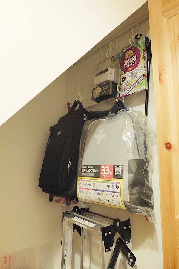 一番高い壁には、突っ張り棒、ワイヤーネット、S字フックを駆使して壁掛け収納を作った。避難用品をここに収納し、床が少し見えてきた。