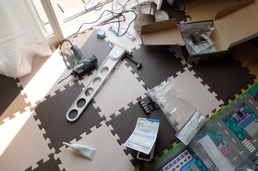 和室の先に物干しはない。自分で取り付けることにした。資機材が入り乱れる。