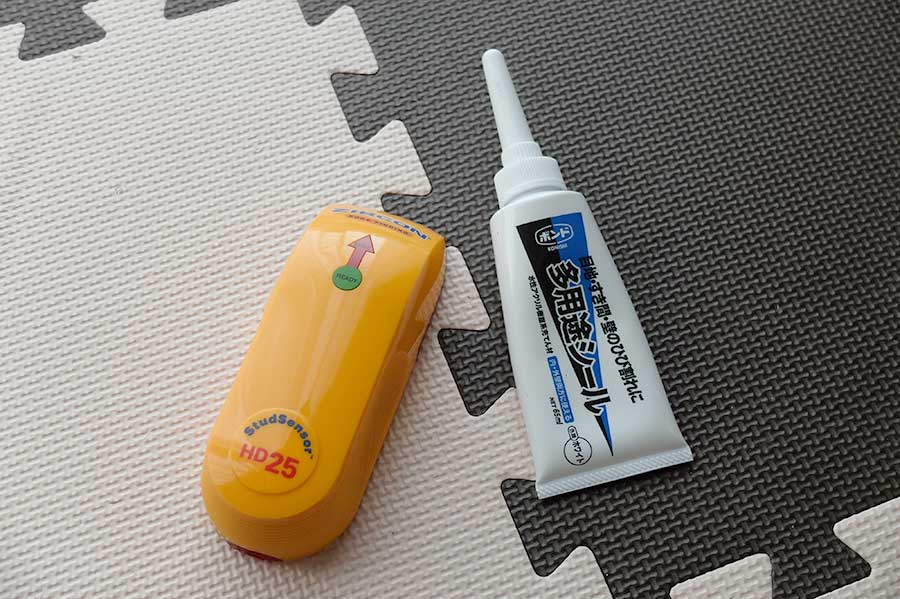 壁裏探知機(ジルコン HD25)とコーキング剤。前者はビス穴を確実に木部へ開ける為で、後者は開けた穴に雨水が浸入しないようにする為に用意した。