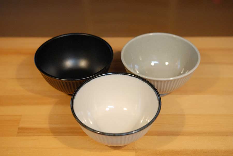 茶碗も近所のホームセンターで買ったようなものや樹脂製の子供茶碗だったので、ニトリで同じく美濃焼のものを揃えた。銀灰釉(灰色)・呉須流し(白)・いぶし天目(黒)。各約400円。