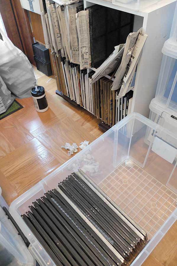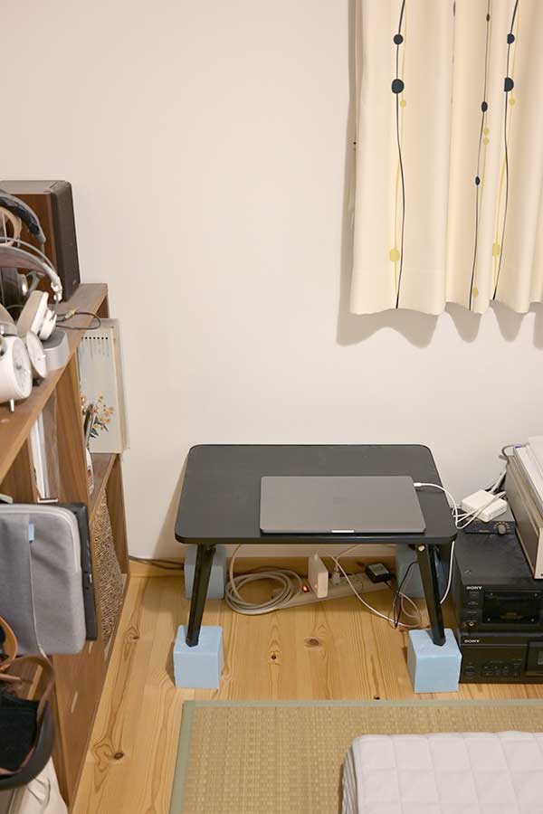 枕元に小さな折り畳みテーブルを据え、正座すると低過ぎるので立方体のスタイロフォームを机の脚に足していた。こんなギコギコ*の、吹けば飛ぶような環境で細々と活動を続けてきた。資料を参照しながらの執筆は困難で、布団に資料を広げて何度も体を捻りながらの作業だったし、スキャナーやディスクドライブは必要な時だけ床に置いていた。活動を絶やさない為の最低限度の作業環境だった。勿論捗る筈がない。
