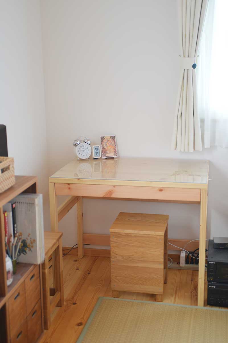 所謂パソコンデスク(死語?)は却下、鉄や樹脂製など人工的なものも却下、MDF(中質繊維板)製は黴の温床となるので絶対に不可、無垢の木一択で探した。だからといって受注生産のものは過剰品質になってしまうので、ごくシンプルで簡素なものを探した。いつも頼りにしている無印良品の実店舗で何種類かの机を見付けた。自宅が無垢の松で作られていて景観が合うのと、寸法が丁度良かったのでこれを選んだ。