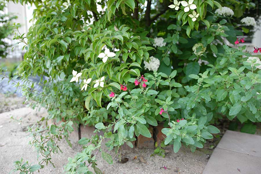 その根元にはチェリーセージが紅を添え、心地良い色の対比を作っている。数年かけてやっと「お庭」らしくなってきた。