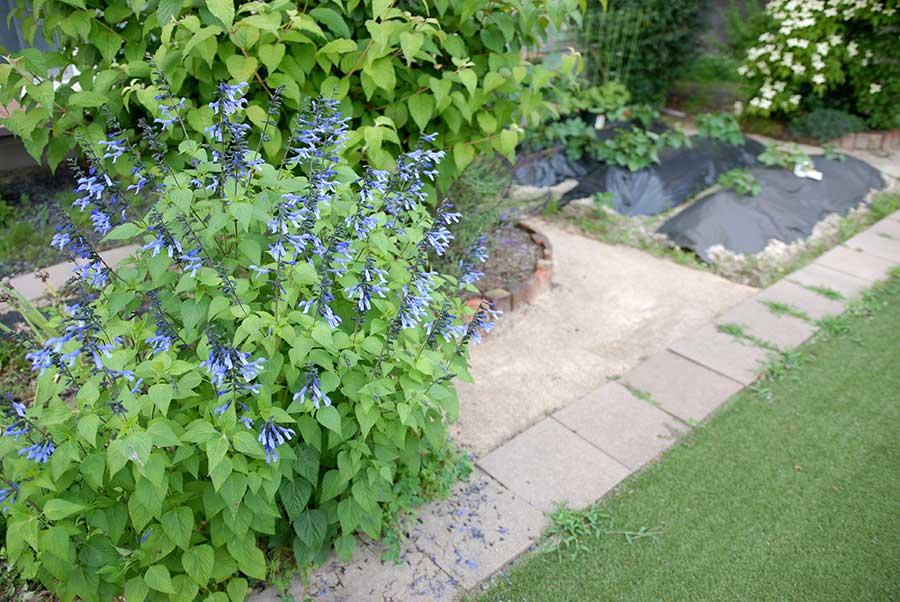 円形花壇で成長しすぎたので、施肥していない土の場所に移植したサルビア。気に入ったらしく、青紫の花を沢山咲かせてくれた。奥には花を終えた大手毬の木が大きく育つ。右手にはサツマイモ畑、更にその右に常緑ヤマボウシが居る。