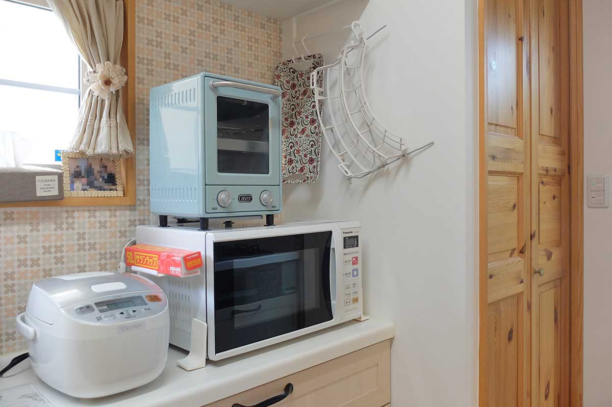 台所の乙女な雰囲気によく馴染んでいる。そして2段ということもあり占用面積が小さく、一帯がすっきりした印象だ。既存のオーブントースター、炊飯器、電子レンジは私達が新しい生活を始めた10年前に購入した同期。なるべく機能が少なく外観がシンプルなものをと思い選んだものだ。特別気に入っているという訳ではないが、見た目が古臭くなることも悪目立ちすることもなく、故障も全くなく好ましい。トースターは処分せず予備機として保管しておく。