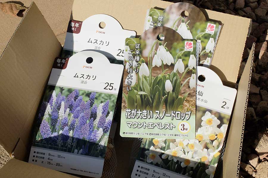 植えたのは、ムスカリ、スノードロップ、水仙。いずれも3月から4月にかけて満開を迎えるので、大きな花が咲かない時期の彩りを期待した。