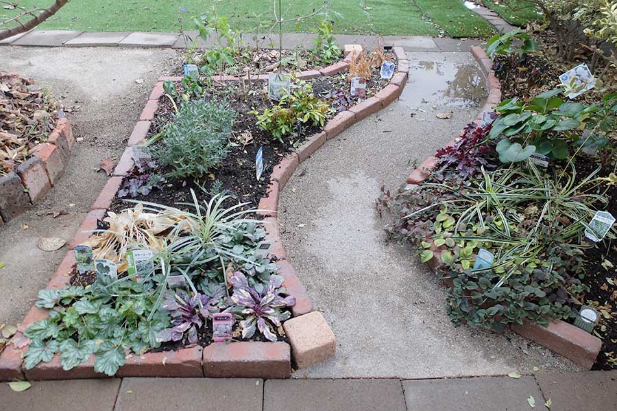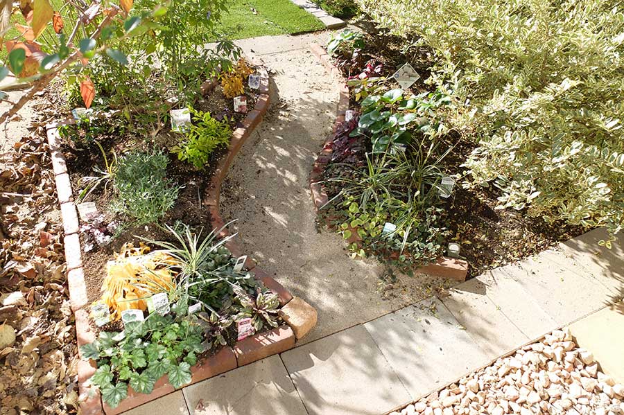 色とりどりでありながら調和の取れた花壇。その邪魔をしない黒ラベルにしたら植物に目が行くようになり、見違えて景観が良くなった。