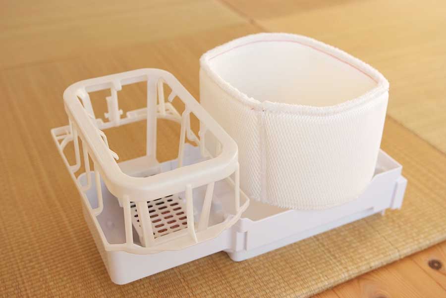タンクから供給された水がこの受け皿へ流れ、四角い筒状のフィルターが水を吸い、そこにファンで風を送って水蒸気を放散させるという仕組みだ。つまりフィルターは常に湿っている。そこへ暖かい空気が供給される。ということは、黴を養殖しているようなものだ。湿ったバスタオルが脱衣所で湿り続けていたらどうなるか、心当たりがある。