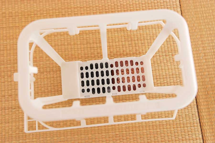 布製の網状になったフィルターは籠のような形状のもので固定されていて、水が付く底面には申し訳程度に針葉樹の木片と活性炭が入れてあった。これだけの事で黴びなくなる訳がないでしょう。