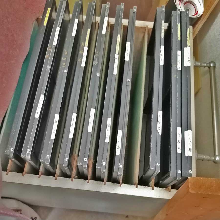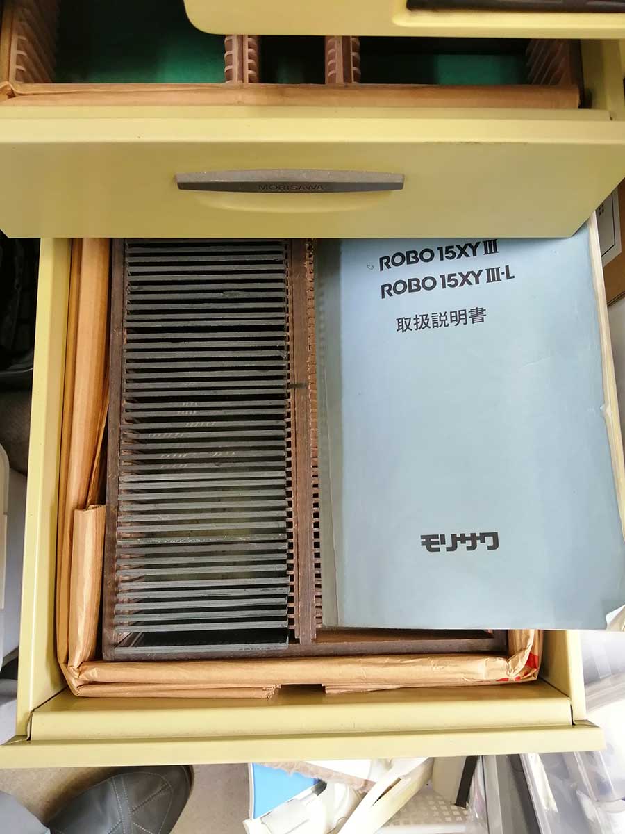 「弊社で昔使用していた写植機が5台現存していることに気がつきました。埋もれている荷物をどかして見たところ、外見だけの様子は保存状態も良く、メインプレートやサブプレートなども相当な量が残っていました。